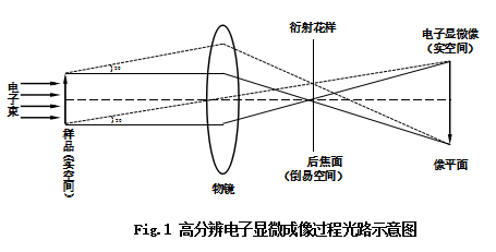 如Fig.1所示为高分辨电子显微成像过程的光路示意图,具有一定波长(λ)的电子束入射到晶面间距为d的晶体时,在满足布拉格条件(2dsinθ=λ),在特定角度(2θ)处产生衍射波。这个衍射波在物镜的后焦面上汇聚成一点,形成衍射斑点(在电子显微镜中,后焦面上形成的有规则的衍射斑点,投影到荧光屏上,便就是所谓的电子衍射花样。)。在后焦面上的衍射波继续向前运动时,衍射波合成,在像平面上形成放大的像(电子显微像),在后焦面上插入大的物镜光阑时可以使两个以上的波干涉成像,称之为高分辨电子显微方法,所观察的像称之为高分辨电子显微像(高分辨显微像)。