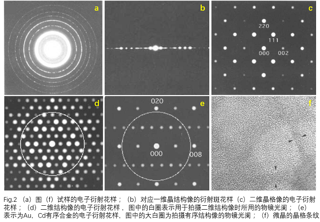 特殊的像:在后焦面的衍射花样上,插入光阑只选择特定的波成像是就能够观察到对于特定结构信息衬度的像。它的一个典型的例子是有序结构像。所对应的电子衍射花样如Fig.2(e)所示为Au,Cd有序合金的电子衍射花样。该有序结构是以面心立方结构为基础,Cd原子在其中有序排列,Fig.2(e)电子衍射花样除指数(020)、(008)强的基本晶格反射外,出现弱的有序晶格反射,用物镜光阑出去基本的晶格反射,使用透射波和有序晶格反射成像时,只有Cd原子以明亮的点或暗点如高分辨像Fig.4所示