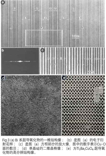 二维结构像:得到如Fig.2(d)所示的衍射花样,用这样的衍射花样观察高分辨电子显微像时,参与成像的衍射波越多,高分辨像中所包含的信息也就越多。如Fig.3(e)所示为Tl2Ba2CuO6 超导氧化物的高分辨二维结构像。但是电子显微镜的分辨率极限更高的高波数一侧的衍射不可能参与正确结构信息成像,而成为背底。因此,在分辨率允许得范围内。用尽可能多的衍射波成像,就能够得到含有单胞内原子排列的正确信息的像。结构像只在参与成像的波与试样厚度保持比例关系激发的薄区域才能观察到。