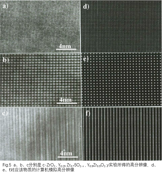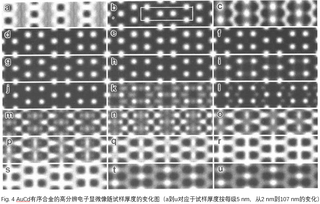 如Fig.4所示,在最佳高分辨欠焦量附近,随着样品厚度的变化,所示的高分辨像也不同。因此当我们拿到一张高分辨像时,不能简单地说这张高分辨像是什么晶体结构,而必须先做计算机模拟计算,就所研究材料的结构,在不同厚度不同欠焦量下计算该物质的高分辨像。得到计算机计算出来的一系列高分辨像与实验所得到的高分辨像作比较,从而确定实验所得到的高分辨像。Fig.5所示计算机模拟像和实验所获得的高分辨像对比。