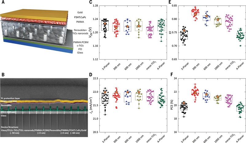 图二、纳米结构TiO2 ETL、纳米图形和控制钙钛矿电池光伏参数的统计分布