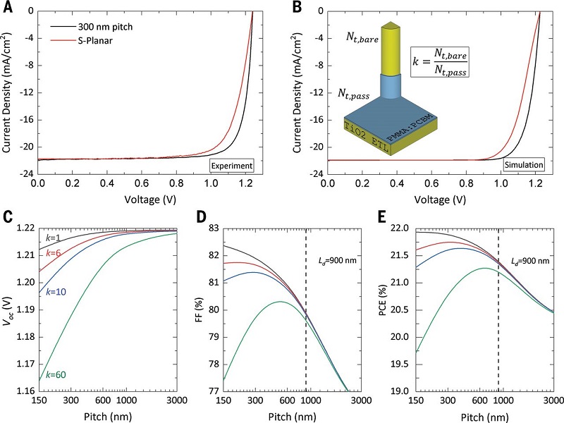 今日,中山大学李俊韬教授、澳大利亚国立大学Kylie R. Catchpole和Kylie R. Catchpole(共同通讯作者)等人报道了一种PSC结构,其中作者利用稀疏的纳米级TiO2纳米棒阵列取代了常用的介孔TiO2(meso-TiO2)电子传输层(ETL)。通过超薄的聚合物钝化层可以有效的钝化产生纳米级图案化ETL-钙钛矿界面,以获得高Voc,同时保持优异的电荷收集和界面传输性能,从而实现低串联电阻和高FF。在大面积(1 cm2)电池上,其功率转换效率(PCE)达到了21.6%,填充因子(FF)更是达到了0.839。在Voc=1.240 V,FF=0.845的条件下,一个小面积(~0.165 cm2)电池的PCE竟然达到了~23.17%。作者使用三维(3D)数值模拟研究和解释了纳米结构界面的性能,精确地复制了FF增强和观察到的纳米级图形几何实验趋势。模拟结果表明,TiO2纳米棒未完全涂覆聚甲基丙烯酸甲酯:PCBM(苯基-C61-丁酸甲酯)钝化材料,使局部低电阻接触的暴露区域直接类似于高效硅太阳能电池中的局部接触结构。通过模拟和实验之间的详细比较,为暴露的纳米棒面积分数和暴露的ETL-钙钛矿界面上复合活性缺陷的密度设定了合理的界限。此外,作者还介绍了一种无离子掺杂的混合空穴传输层(HTL),该层提供了与掺杂替代物类似的电池性能。在85℃和85%相对湿度的条件下,在暴露1000 h后,包含新ETL和HTL组合的封装电池仍然保留了>90%的初始效率。研究成果以题目为“Nanoscale localized contacts for high fill factors in polymer-passivated perovskite solar cells”发表在国际顶级期刊Science上。