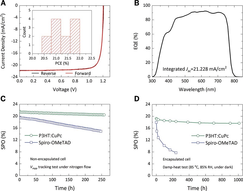 图四、在1 cm2钙钛矿电池上的器件性能和长期稳定性实验