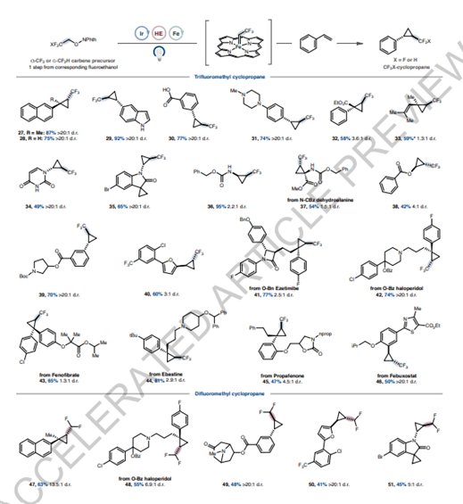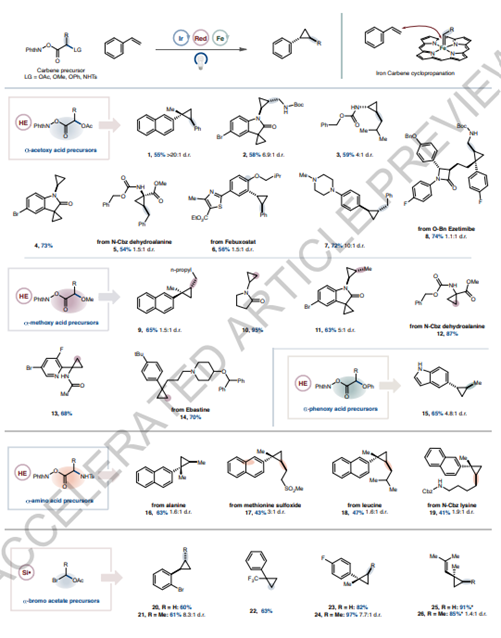 综上所述,研究人员公开了一个概念性的新平台,通过铁催化和光氧化还原催化的合并有效地获得卡宾中间体。该方法克服了使用传统方法获取卡宾中间体的固有局限性,通过环丙烷和σ键插入可获得多种支架,证明了该方法的实用性。该研究提出的策略预计将吸引学术界和工业界的实践者,因为它是一种新的卡宾生成机制,也是一种利用卡宾反应性来提高分子复杂性的强大合成工具。
