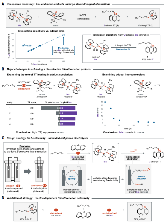 在研究噻蒽(TT)与烯烃形成的双加成物与单加成物的电化学反应性时,研究人员观察到双加成物与单加成物的摩尔比与生成的脱去产物中Z-E异构体比例存在明确对应关系(图2A)。该趋势预示双加成物将选择性脱去生成Z-烯基硫蒽鎓产物1。为验证此预测,研究人员分离出电解生成的微量双加成物,并用弱碱三氟乙酸盐(该试剂不会促进烯基硫蒽鎓异构化)进行处理。实验证实双加成物以近乎完美的Z选择性发生脱去反应,该发现为建立Z选择性C-H官能团化通用策略奠定了基础。
