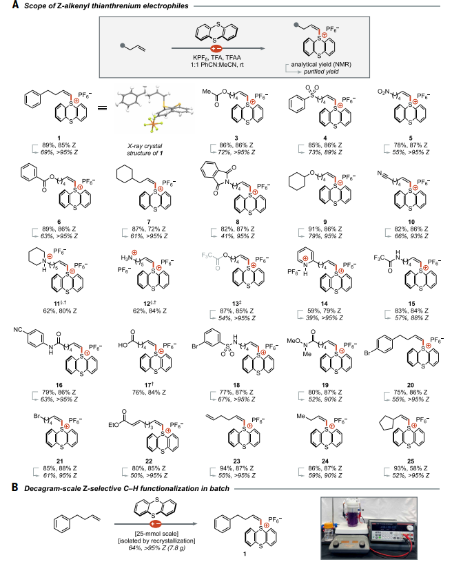 随后,研究人员探究了适用于该Z选择性噻蒽化反应的烯烃范围(图3A)。在整个研究过程中,他们发现该过程的固有Z选择性始终保持在较高水平。此外,这些Z-烯基噻蒽鎓盐具有卓越的结晶性,通过重结晶可获得近乎对映体纯的产物。这相较于传统烯烃合成具有显著优势,在未分隔的反应池条件下,通过含多种常见官能团的末端烯烃,可轻松获得Z-烯基硫蒽鎓盐。其他含亲核性官能团的烯烃底物,如酰胺、羧酸和磺酰胺,均可在不经原位转化情况下实现噻蒽化。