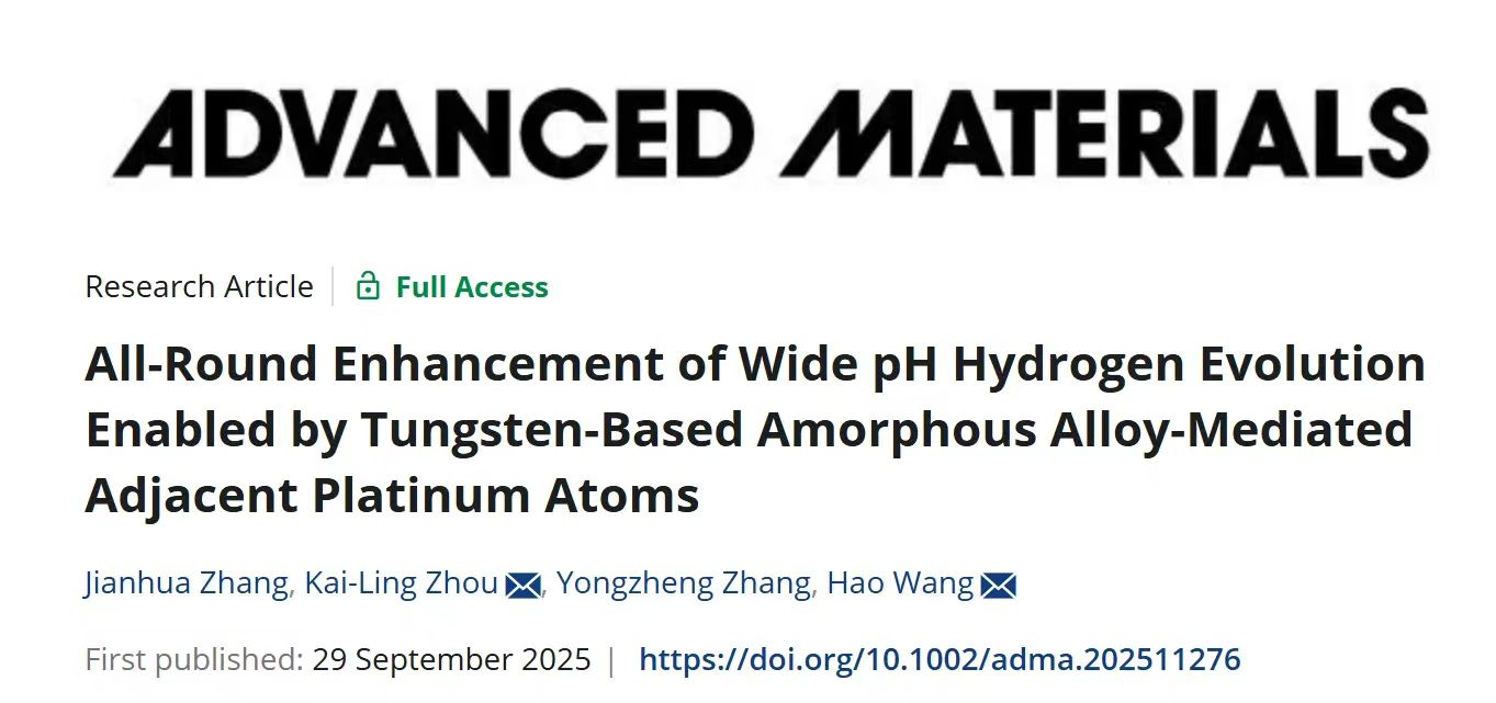 基于此,北京工业大学周开岭、汪浩团队在国际知名期刊《Advanced Materials》上发表题为“All-Round Enhancement of Wide pH Hydrogen Evolution Enabled by Tungsten-Based Amorphous Alloy-Mediated Adjacent Platinum Atoms”的研究论文,团队依托在金属原子结构调控领域的前期研究积累(Adv. Funct. Mater. 2025, 2423476; Appl. Catal. B-Environ., 2024,358:124393; Nat. Commun., 2021, 12:3783),创新性地提出非晶W基合金基底(FeNiWPB)可以为相邻Pt原子的锚定提供丰富的位点(PtASSA@FeNiWPB),通过Pt-载体相互作用在合金表面形成Pt-W/Fe/Ni极化对,诱导电子重新分布使得Pt原子呈富电子态,结合基底对H2O中的H*和OH*的倾向吸附,加速H2O*的解离及H+的还原,并且通过涉及金属-金属协同作用的Tafel步骤促进多个H*吸附和转化(Pt1-H*+Pt2-H*→Pt1-Pt2+H2*)。此外,通过形成稳定的M-W键(M=Pt、Fe、Ni),催化剂的耐腐蚀性显著增强,有效抑制了宽pH范围内的金属浸出,大幅度增强催化剂的稳定性。因此,PtASSA@FeNiWPB在-10 mA cm-2电流密度下表现出超低过电位,酸性介质中为17 mV,碱性介质中为18 mV,其质量活性分别为商业Pt/C的5.8倍(酸性)和63.6倍(碱性)。值得注意的是,该催化剂在酸性和碱性环境中均能保持性能稳定运行600小时,远超无W对照样品(<50小时)及以往报道,使其处于HER性能的前沿。该工作为设计稳定的电催化剂建立了一种普适性策略。博士生张建华为第一作者。这是该团队继2025年9月24日在《Advanced Materials》期刊上发表“Electrochemically Cation-Induced Three-Phase Conversion for Consecutively Tunable Electromagnetic Wave Response”文章之后一周内发表的又一篇工作。