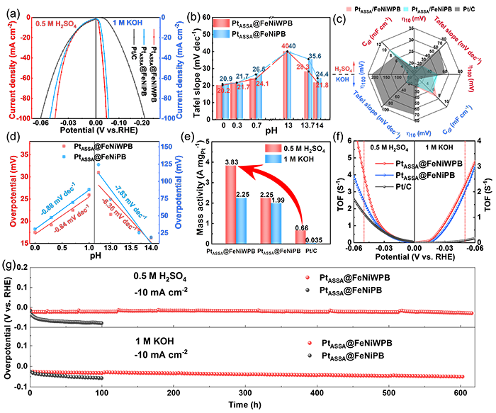 图3比较了催化剂在酸性与碱性介质中的电催化性能。在酸性和碱性介质的不同pH条件下,PtASSA@FeNiWPB催化剂在过电位、tafel斜率、质量活性、TOF和稳定性等方面均具有优异的性能。