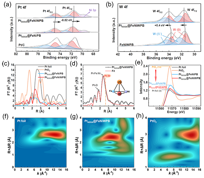 图2通过XPS与X射线吸收精细光谱揭示了W掺杂对Pt电子结构的调控作用。XPS图谱中PtASSA@FeNiWPB的Pt 4f轨道结合能相较于无W样品发生负移,表明W向Pt发生了电子转移,使Pt位点呈现富电子态。EXAFS光谱精确地解析了PtASSA@FeNiWPB结构内Pt单原子的局部配位。XANES光谱揭示了非晶FeNiWPB中相邻Pt原子呈富电子态,说明W的引入使Pt在FeNiWPB中具有富电子的5d轨道占位。小波变换(WT)结果证实了Pt在非晶合金衬底中的单原子分布,且Pt与原子序数较小的金属元素Fe、Ni和W形成配位键。
