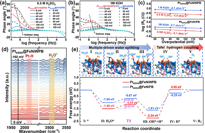 图4原位表征结合DFT理论计算揭示了催化反应机制。EIS分析显示PtASSA@FeNiWPB在反应过程中具有较低的氢吸附阻力与更快的电荷转移动力学。原位ATR-FTIR谱图中在3525 cm-1与2017 cm-1处分别观察到H₃O+与Pt-H⁺的特征吸收峰,证实了水分子在催化剂表面高效解离与氢中间体的快速形成与转化。理论计算进一步表明,W的引入不仅提高了H2O分子的吸附能,还显著降低了水解离能垒,并通过优化Pt位点的d带中心与氢吸附自由能,促进了多原子协同的Tafel步骤。