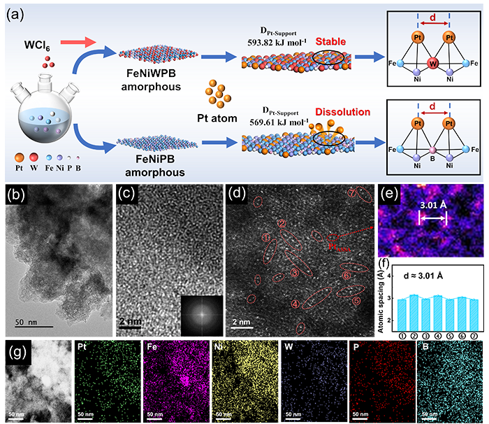 图1展示了催化剂的合成路径与微观结构表征。通过化学还原与电化学沉积相结合的制备策略,成功在非晶FeNiWPB合金载体上构筑了原子级分散且间距约为3.0 Å的相邻Pt单原子位点。TEM证实了FeNiWPB载体的非晶特征,HAADF-STEM图像证实了Pt的原子级分散及相邻Pt单原子位点的平均间距。