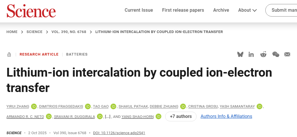 原文信息:Yirui Zhang et al. , Lithium-ion intercalation by coupled ion-electron transfer. Science 390, eadq2541(2025).