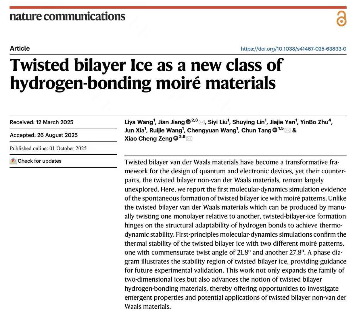 江苏大学唐淳教授、王丽雅副教授团队与香港城市大学讲座教授曾晓成团队合作,在《Nature Communications》发表最新研究成果(https://doi.org/10.1038/s41467-025-63833-0),首次发现在纳米受限环境中可自发形成具有摩尔超晶格的扭转双层冰(Twisted Bilayer Ice, TBI),为氢键摩尔材料的研究打开了新窗户。该成果不仅拓展了二维冰相图,更为设计非范德华扭转材料提供了新的理论框架。