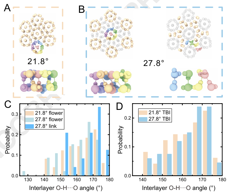 通过分析氢键相互作用(图3),团队发现:扭转冰的层间氢键呈现独特的成键规则:扭转冰的结构从构型上看可归类为“花朵”和“桥”两种。花朵内的水分子只在花朵内部形成层间氢键,所以21.8°构型中每个花朵含7个层间氢键,呈现均匀倾斜特征;相比之下,27.8°构型中花朵内形成氢键数目略低,由于倾斜程度更高,花朵内一对一的层间成键规则被打破,存在同一个水分子与另外一层水分子重复成键的现象,落单水分子并不会参与层间成键。此外,27.8°构型中花朵通过AB堆垛的“桥”进行连接,桥内水分子满足一对一成键法则,形成24个层间氢键。对局部花和桥内氢键的强度分析发现,满足27.8° 桥>21.8° 花>27.8° 花的关系。而对于整体TBI而言,21.8°和27.8°两种扭转冰构型的层间氢键强度相当。双层扭转冰的稳定存在依赖于大量水分子的周密配合,因此,扭转冰一旦形成非常稳定。