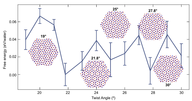基于机器学习势分子动力学模拟计算得到的吉布斯自由能证实了21.8°和27.8°扭转冰结构的稳定性(图2)。