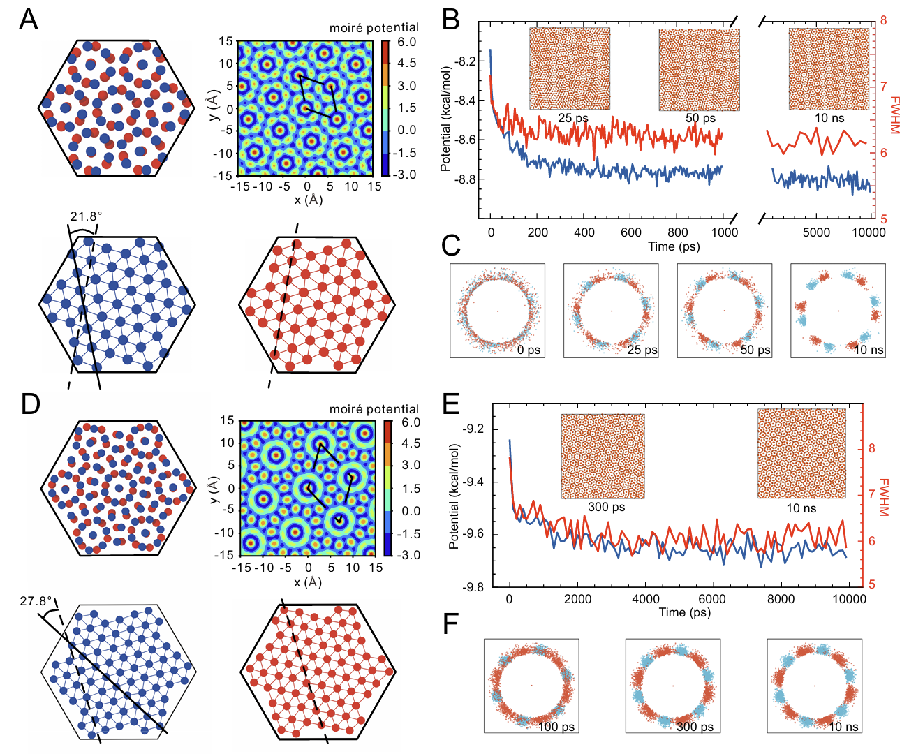 与需要人工扭转的范德华材料不同,扭转双层冰的形成依赖于氢键网络的结构自适应能力。研究团队通过经典和基于机器学习势的分子动力学模拟,发现当侧向压力超过3.0GPa时,水分子会在8.0Å宽的石墨烯纳米通道中自发结晶为两种稳定扭转构型:21.8°和27.8°扭转角。这两种构型呈现出独特的”花朵状”超晶格结构(图1)。