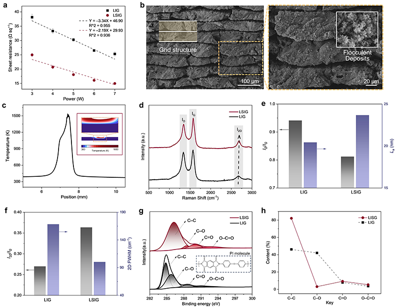 图1 LSIG形貌与缺陷结构表征:(a)LIG与LSIG方阻与激光功率的关系;(b)LSIG的SEM图;(c)前驱体表面温度分布;(d)LIG与LSIG的拉曼光谱;(e)D峰与G峰强度比(ID/IG)及对应的晶粒尺寸(La);(f)2D峰与G峰强度比(I2D/IG)及2D FWHM;(g)C 1s谱;(h)LIG与LSIG的键含量