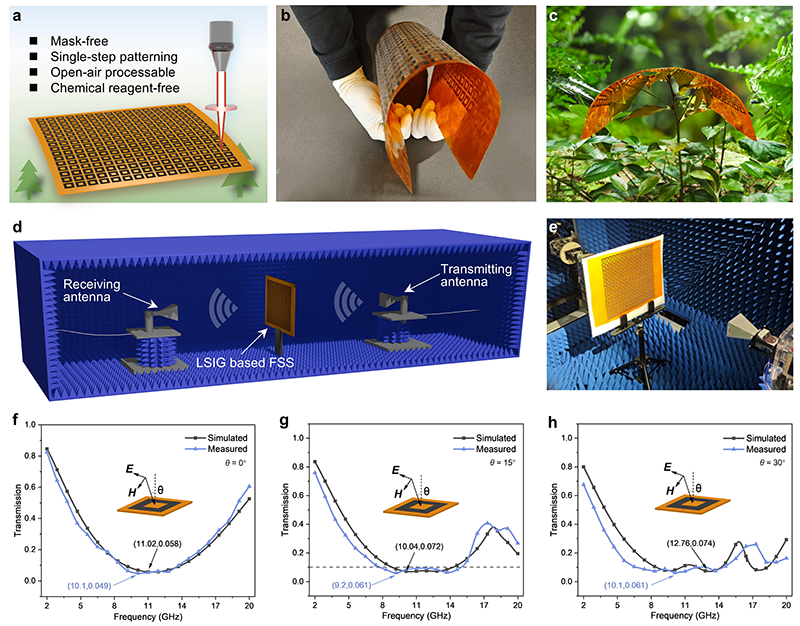 图2 LSIG-FSS性能测试:(a-c)LIG技术优势示意图;(d-e)电磁试环境;(f-h)不同入射角下FSS透射系数仿真与实测对比
