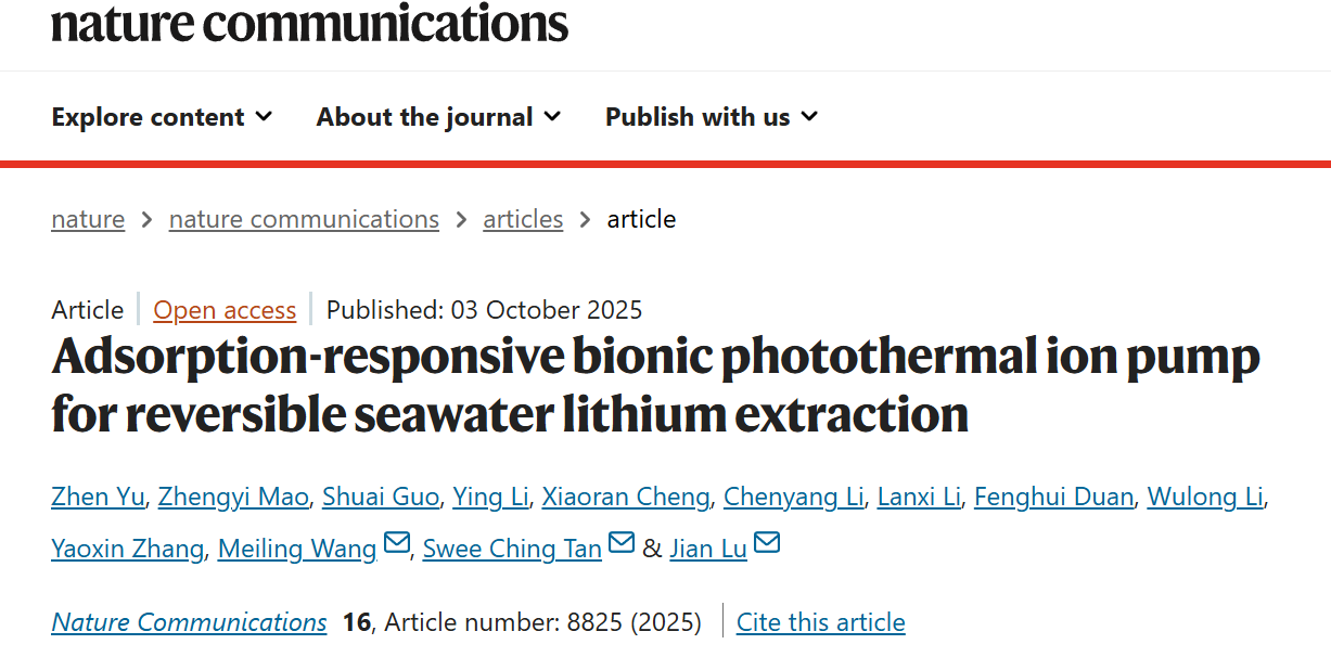 该工作近期以“Adsorption-responsive bionic photothermal ion pump for reversible seawater lithium extraction”为题,于2025年10月在线发表于《Nature Communications》。香港城市大学吕坚院士,新加坡国立大学Tan Swee Ching教授和太原理工王美玲教授为论文共同通讯作者。Zhen Yu博士和Zhengyi Mao博士为本文共同第一作者。本研究在吕坚院士团队前期开发的太阳能驱动的水电联产技术基础上,将研究主线拓展至太阳能驱动的非碳能源或资源提取领域,并致力于在未来构建一个覆盖多种海水及盐湖资源综合利用的技术体系。