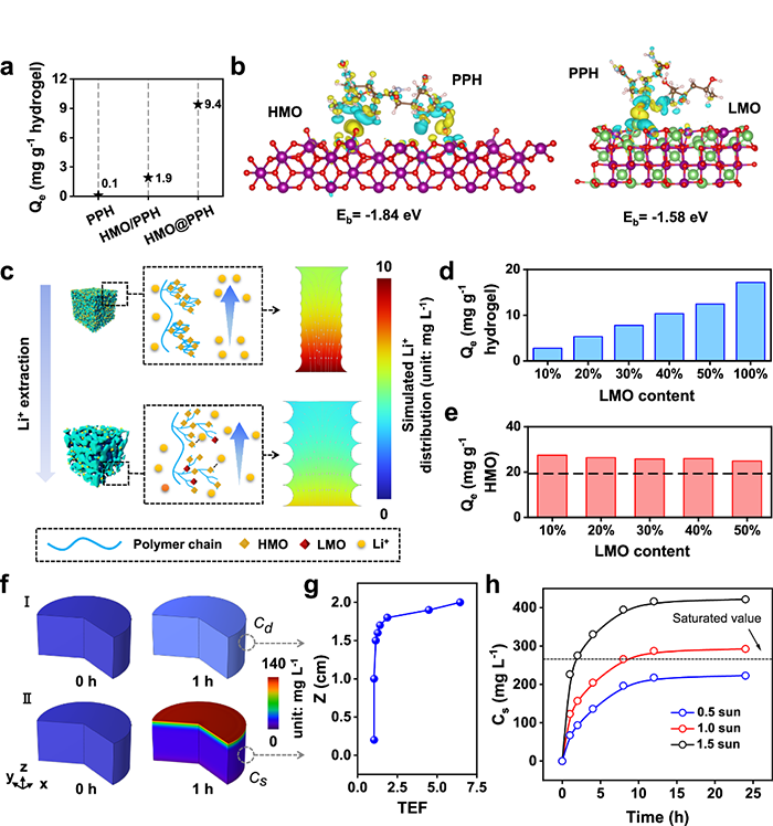 APIP优异的Li+提取性能主要源于以下几个方面:(1)HMO的均匀分布。通过原位置换法使HMO在体系中充分分散,确保了活性位点的有效利用;(2)吸附响应型溶胀效应。在提锂过程中,APIP会逐步膨胀,暴露出更多吸附位点,从而显著提升吸附效率。相较之下,HMO粉末在海水中易发生团聚,难以充分发挥吸附能力,而APIP则保持甚至超过粉末材料的提锂性能;(3)低溶损特性。APIP结构设计合理,一方面内部自由水含量较低,可有效抑制Mn2+溶出;另一方面,聚合物链能够选择性螯合Mn2+,进一步防止HMO流失;(4)光热蒸发驱动的富集效应。太阳能蒸发过程增强了溶液中Li+浓度梯度,从而促进其快速富集与高效分离。