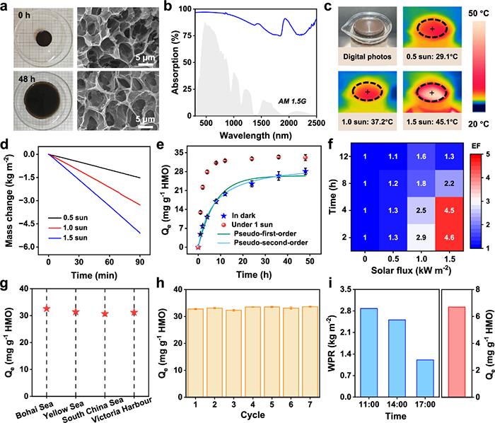 在1 sun下,APIP的蒸发速率可达约2.22 kg m−2 h−1。随着太阳通量由0.5 sun升至1.5 sun,其稳态温度由29.1 °C增至45.1 °C,蒸发速率同步提升至约4.42 kg m−2 h−1。与无光环境相比,光照显著加速了APIP的锂离子提取过程,其中在1 sun条件下的提取速率较暗态提升约2.9倍。为量化光照对提锂行为的促进作用,研究者引入增强因子(EF)作为评价指标。结果表明,当光照时间为2 h且太阳通量从0增至1.5 sun时,EF值由1增至4.6。在连续运行60 h后,APIP在多种海水样品中均表现出稳定的Li⁺提取能力,其中在渤海样品中达到最高提取量,约为32.6 mg g−1 HMO(图2g),这与该地区较高的锂含量相关。经过7次循环实验,材料仍维持约34 mg g-1 HMO的提取容量(图2h),表现出优异的循环稳定性。此外,在香港城市大学进行的户外测试中(使用深圳湾海水),APIP实现了约6.6 kg m−2的产水速率及约6.7 mg g−1 HMO的Li⁺提取性能。