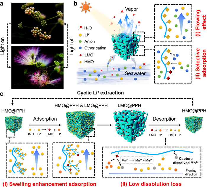 锂离子筛(LIS)海水提锂为缓解锂资源短缺提供了新方向,但其在应用中仍存在吸附速率慢、材料易溶损等限制。尤其是造粒处理后,LIS的吸附性能常明显下降。因此,亟需构建高效、稳定、环境友好的提锂体系,以推动海水锂资源的大规模利用。针对上述难题,香港城市大学吕坚院士团队联合新加坡国立大学Tan Swee Ching教授及太原理工大学王美玲教授,研发了一种受合欢花结构启发的吸附响应光热离子泵(APIP),可实现可逆海水提锂。该材料在吸附过程中会产生溶胀响应并暴露更多锂吸附位点,使Li⁺提取量达34 mg g⁻¹ HMO,性能优于传统HMO粉体。同时,低自由水含量及聚合物链对Mn²⁺的选择性螯合作用显著降低了材料溶损。APIP的提出突破了粉末型LIS规模化应用的瓶颈,为海水锂提取与可持续资源开发提供了新的解决思路。