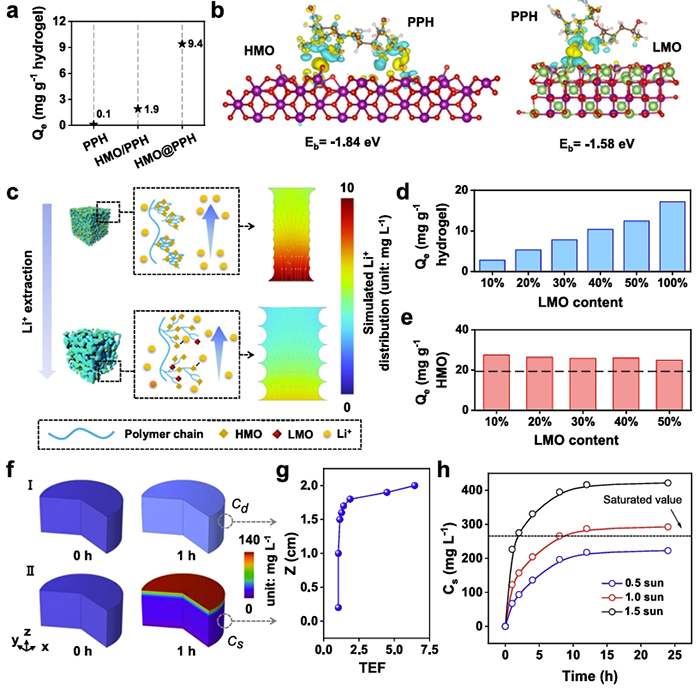 图3 Li+提取增强机制。a 黑暗条件下的Li+提取容量(Qₑ)比较。初始条件:298 K,pH = 10,Li+溶液浓度为25 ppm。b LMO(或HMO)与PPH之间的差分电荷和结合能。c 通过溶胀过程增强锂吸附的示意图(左),以及具有不同溶胀特性的HMO@PPH通道中模拟的Li+分布(右)。d 基于水凝胶重量的HMO@PPH的Li⁺提取容量(Qe)。e 基于HMO重量的HMO@PPH的Li⁺提取容量(Qe)。水平虚线是HMO粉末的Li⁺吸附容量。f 通过COMSOL软件模拟的不同条件下APIP中的Li⁺分布:(I)在黑暗中,(II)在1个太阳光照下。g 通过COMSOL软件获得的APIP中不同位置的理论增强因子(TEF)。h 通过COMSOL软件获得的在不同太阳通量下APIP的理论Li⁺吸附浓度。虚线指APIP的Li⁺饱和吸附浓度。