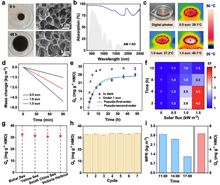 图2 太阳能驱动海水淡化和Li⁺提取性能。a HMO@PPH在模拟海水中浸泡0小时和48小时后的数码照片和SEM图像。b HMO@PPH的紫外-可见-近红外光谱。c 不同太阳通量下APIP的数码照片和红外照片。d 不同太阳通量下APIP的质量随时间的变化。e 在1个太阳光照或黑暗条件下,不同持续时间APIP的Li⁺提取容量(Qe)。f 对应于不同太阳通量和Li⁺提取时间的增强因子(EF)。g在1个太阳光照下,APIP在不同真实海水样品中的Li⁺提取容量(Qe)。h 在1个太阳光照下的循环Li⁺提取容量(Qe)。误差棒代表三次测量的标准差。i 为期一天的户外实验中APIP的产水率(WPR)和Li⁺提取容量(Qe)