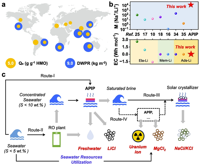 图4 APIP的兼容性和应用前景。a 全球各地APIP的预测日水产率和Li⁺提取容量。b 不同技术从盐湖/海水中提Li+的比较:进料溶液中Na⁺和Li⁺的摩尔比和能耗。c 基于界面蒸发技术的海水资源利用路径。