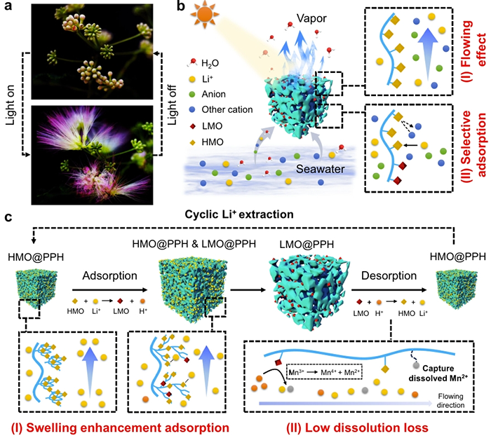 本文核心的创新在于受合欢树启发,设计并构建了一种集多种仿生功能于一体的“吸附响应型光热离子泵(APIP)”,实现了HMO的均匀限域与稳定集成。通过一种创新的原位交联与离子交换策略,将氢锰氧化物(HMO)均匀地、稳固地集成在互穿网络水凝胶(PPH)中,形成了HMO@PPH复合结构。这一结构从根本上解决了粉末状HMO在成型过程中容易团聚、导致吸附性能下降的问题,为高效吸附提供了基础。复合水凝胶形成了“吸附-溶胀”正反馈循环。APIP模仿合欢花遇光绽放的行为,具备独特的吸附响应溶胀特性。在吸附锂离子后,材料会自发膨胀,从而动态地暴露出更多的隐藏吸附位点。这形成了一个“越吸附,越溶胀;越溶胀,越吸附”的正反馈循环,使其最终对锂离子的提取容量超过了原始HMO粉末,突破了传统吸附材料的性能上限。APIP充分利用太阳能,不仅通过光热效应产生蒸发对流,局部浓缩锂离子,加快了传质过程;还利用产生的热能进一步提升吸附动力学。在太阳光照射下,其锂离子提取动力学速率提升了2.9倍,实现了近乎零额外能耗的高效提取,并同时具备淡水生产的能力。