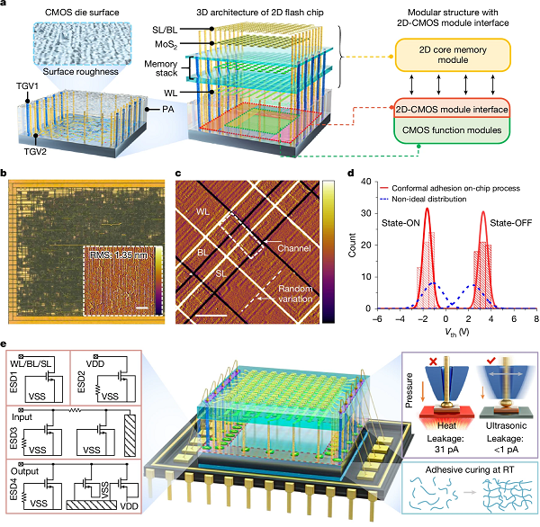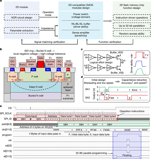 基于以上难题,复旦大学刘春森博士、周鹏教授在Nature上发表了题为“A full-featured 2D flash chip enabled by system integration”的论文,报道了一种原子器件到芯片(ATOM2CHIP)技术,以解决工艺和电路设计级别的2D系统集成挑战。研究人员通过在CMOS芯片上集成2D NOR闪存模块来演示全功能存储芯片,该芯片结合了高级2D电子器件作为存储核心和强大的CMOS平台来支持复杂的指令控制。利用全堆叠片上制造工艺,得到的2D闪存芯片实现了94.34%的高成品率。所制造的2D闪存单元具有20 ns的快速编程/擦除操作,每比特编程能耗低至 0.644 pJ,且具备良好的可靠性。此外,所提出的跨平台系统设计促进了具有指令驱动操作、32位并行性和随机访问的2D-NOR闪存芯片的功能。本研究跨平台系统设计建立了二维电路与成熟CMOS平台的兼容性验证方法,为后续其他二维电子器件的系统集成提供了可参考、可复用的技术范式,突破了二维电子学仅停留在器件层面研究的局限,推动二维技术从“实验室概念”向“工业级应用”迈出关键一步。