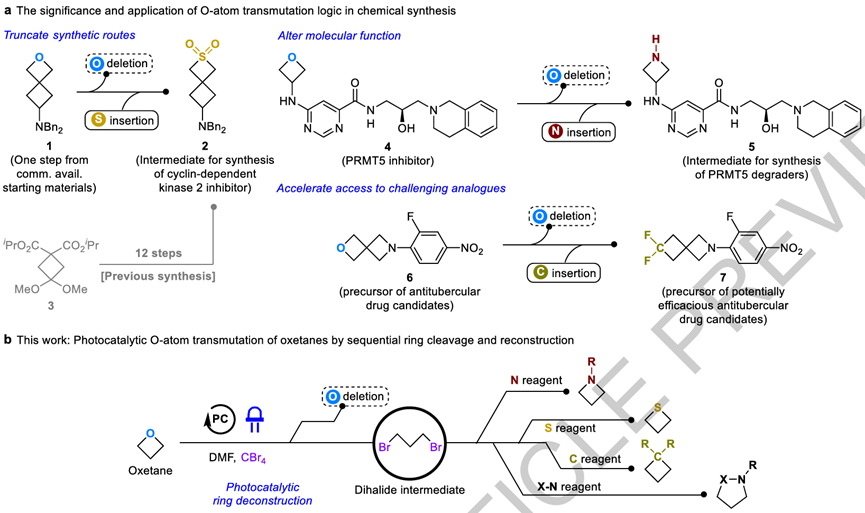 四元环状结构如氮杂环丁烷、硫杂环丁烷和环丁烷在药物化学中具有重要地位,因其在生物活性分子中常具备优异的理化性质,如高稳定性、代谢稳定性和靶向特异性。然而,传统合成这些环系的方法通常依赖于多步环加成或亲核取代反应,步骤繁琐、效率低且产生大量废弃物。因此,开发一种能够直接、高效地将易得的氧杂环丁烷中的氧原子替换为氮、硫或碳原子的方法,具有重要的合成价值与应用前景,尤其适用于药物分子的后期功能化与结构多样性拓展。