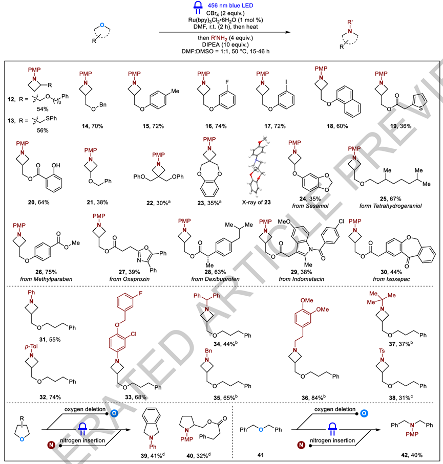 一系列2-位和3-位取代的氧杂环丁烷,包括带有芳基、硫醚、卤代芳烃、酯基、噻吩、酚和环醚等官能团的底物,均能高效转化为相应的氮杂环丁烷产物(12–23)。此外,该策略适用于含多个亲核或亲电位点的生物活性分子,如药物衍生物24–30,以及具有不同电子与空间性质的芳香胺(31–33)、脂肪胺(34–37)和磺酰胺(38)。反应还可拓展至五元环底物和无环醚,分别生成异吲哚啉39、吡咯烷40和叔胺42,显示了该方法的广泛适用性与官能团容忍度。