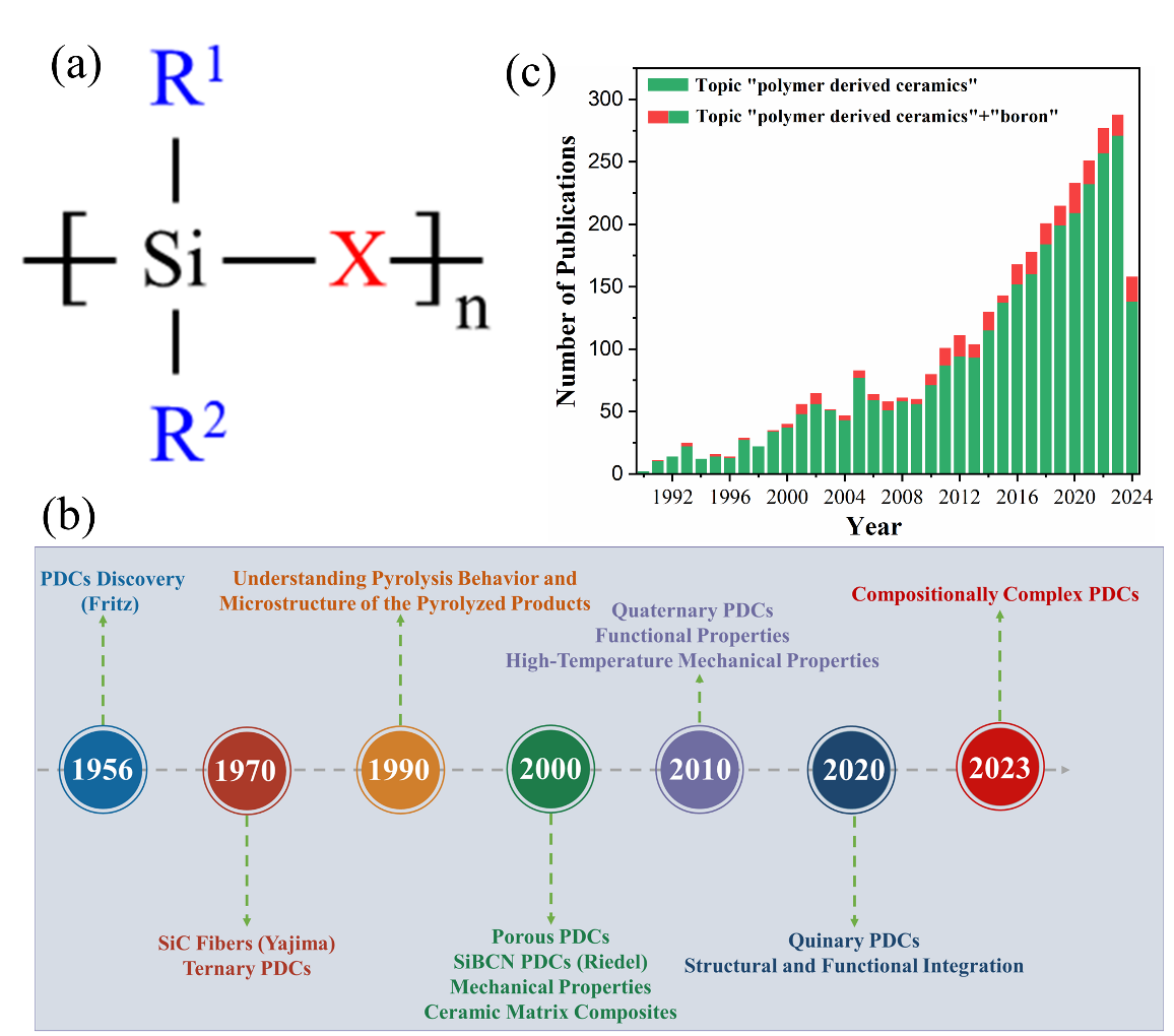 图1 (a)硅基先驱体分子结构示意图;(b)聚合物先驱体转化陶瓷(PDC)研究发展的时间线和(c)发文量。