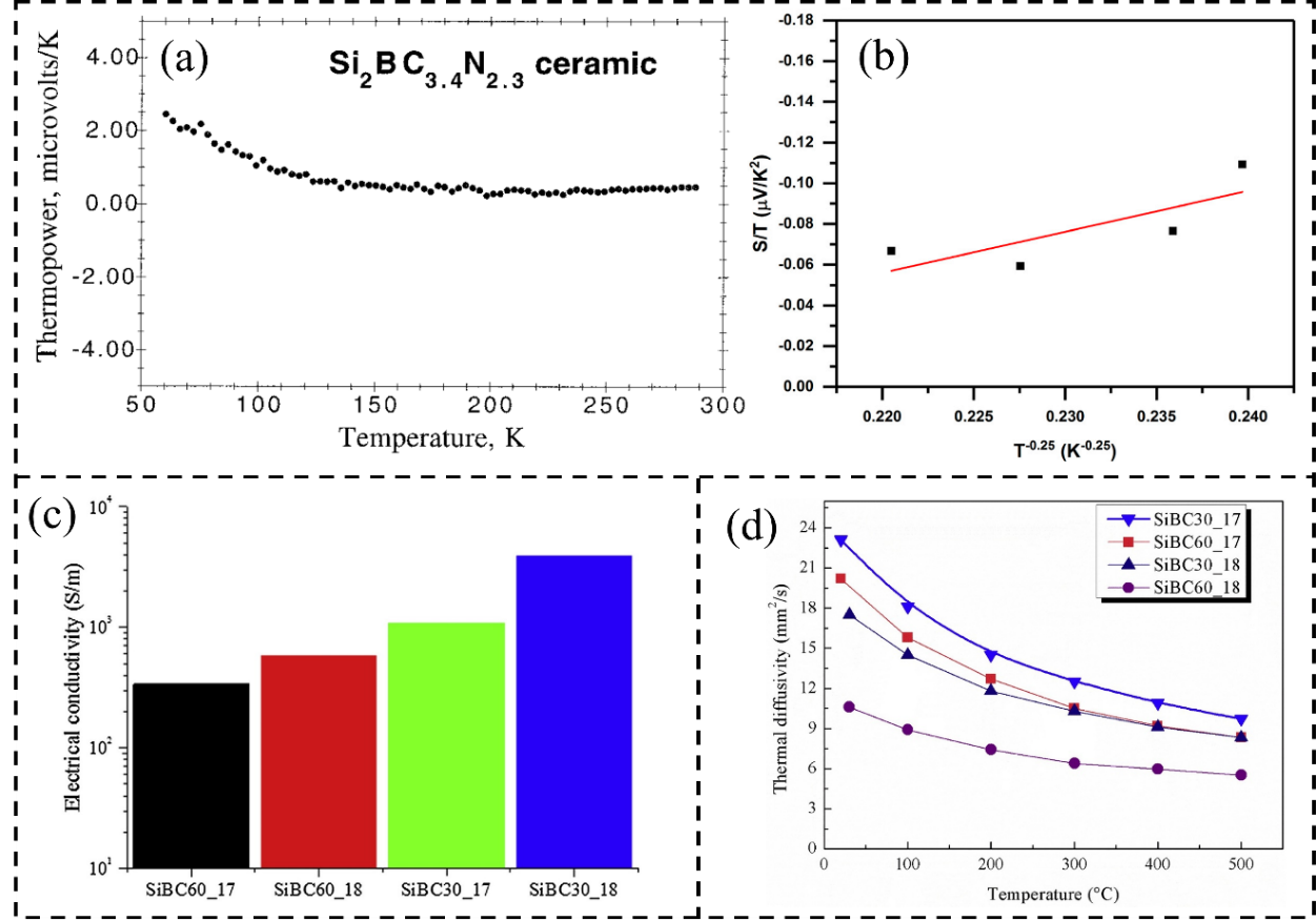 图12 (a)SiBCN陶瓷的热电势;(b)SiOC/1 wt% h-BN的Seebeck系数;(c)SiBC样品的电导率;(d)SiBC样品的热扩散。