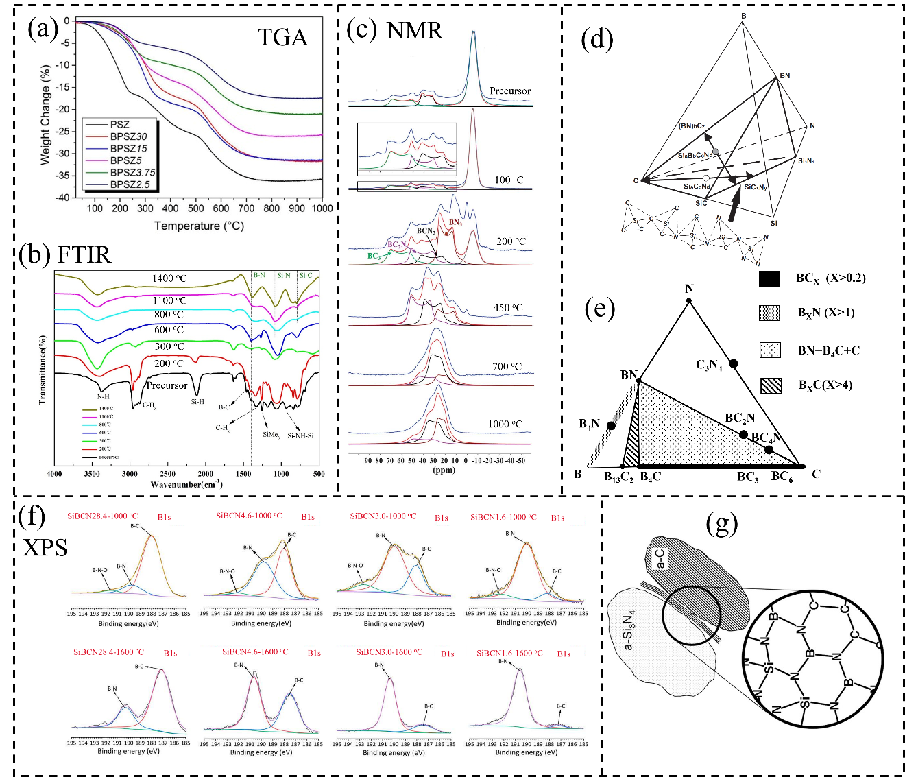 图5 (a)聚硅氮烷与二甲基硫醚硼烷的热重(TG)曲线;(b)不同温度下热处理的硼改性聚硅氮烷的FTIR光谱;(c)硼改性聚硅氮烷的NMR谱图;(d)SiBCN相分离示意图;(e)BCN三元相图;(f)在SiBCN陶瓷XPS图谱;(g)SiBCN陶瓷显微结构示意图。