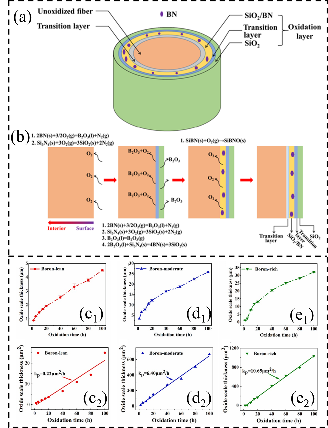 图10 (a)SiBN纤维氧化层显微结构模型;(b)SiBN纤维氧化过程的示意图;(c)贫硼、(d)中等硼含量及(e)富硼单相SiBCN氧化层厚度(上)及其厚度平方(下)随氧化时间的变化关系。