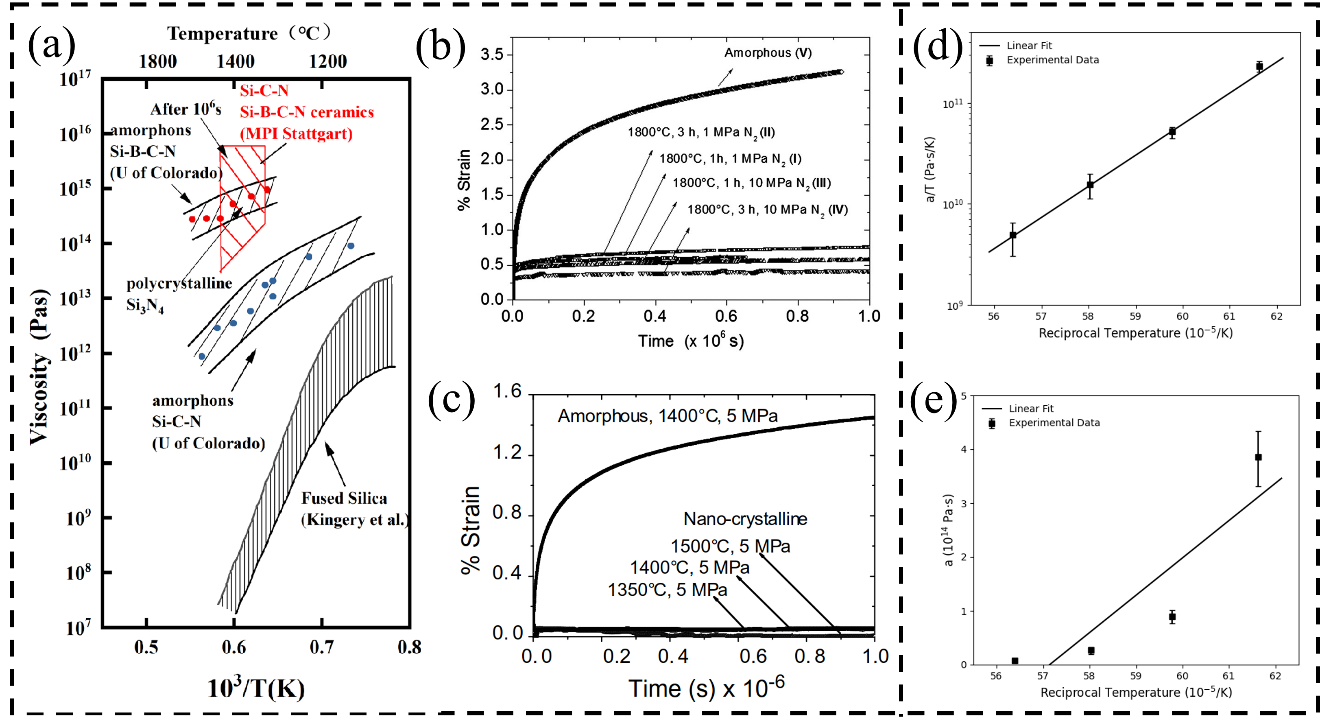 图8 (a)SiBCN陶瓷与SiCN、熔融石英及多晶Si3N4的粘度(b)非晶与纳米晶SiBCN陶瓷的压缩蠕变随时间变化关系;(c)SiBCN陶瓷的压缩蠕变行为;(d)基于自由体积模型及(e)“两步”弛豫模型的SiBCN陶瓷粘度的温度关系。