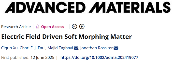 在软体机器人领域,如何实现无线且精准的变形控制一直是核心难题。近日,来自英国布里斯托大学(University of Bristol)的研究团队在《Advanced Materials》上发表论文,提出了一种能够在外部电场作用下产生大幅形变的新型软体材料——电致变形凝胶,论文第一作者为徐慈群博士。该材料在驱动机理与应用拓展方面均取得突破,为软体机器人的驱动提供了新路径。研究成果已被作为正封面文章刊登。