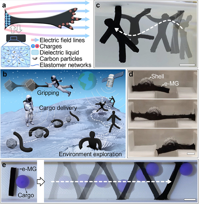 图1 软体机器人的形变能力展示。a.材料的结构。b.未来太空应用场景。c. 体操机器人。d. 蜗牛机器人。e. 在狭窄通道中运送货物。