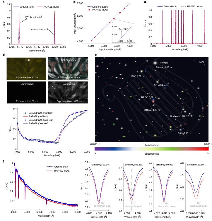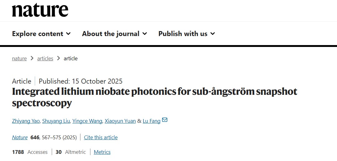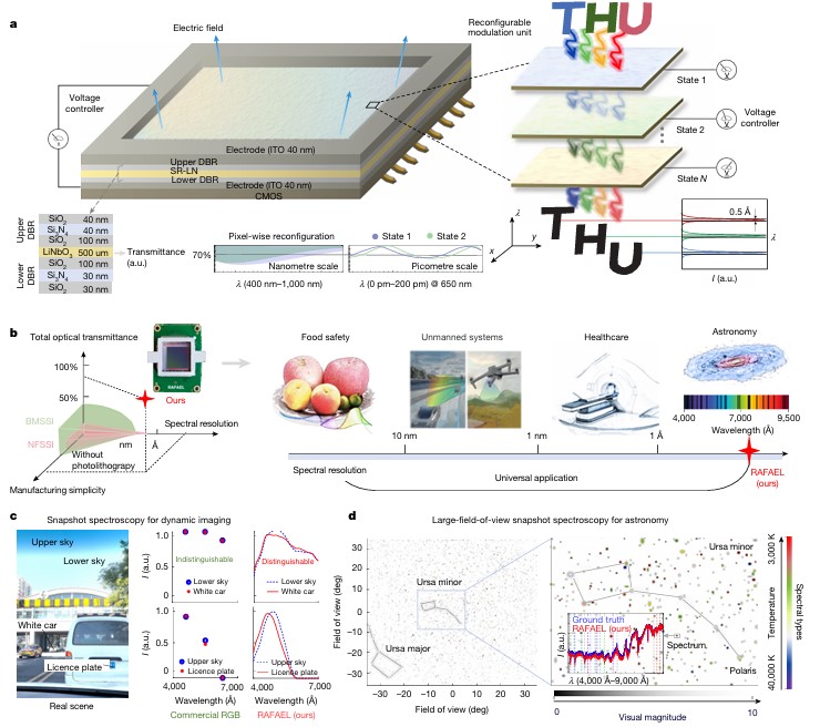 近日,来自清华大学的方璐教授课题组在国际知名期刊Nature发表题为《ntegrated lithium niobate photonics for sub-angstrom snapshot spectroscopy》的研究论文,提出了一个具有革命性性能的RA照RAFAEL系统,更通过其精巧的物理设计(可重构铌酸锂)和智能的计算重建算法(PSAIR),实现了前所未有的综合性能指标,显著超越了现有技术,总透过率高达 73.2%,亚埃级光谱分辨率可达到约 0.5 Å,单次曝光能以 88 Hz 的帧率同时获取超过1200万空间像素,从根本上解决了光谱学领域长期存在的“分辨率-透过率-效率”三者难以兼顾的难题,为未来的高光谱成像技术开辟了全新的道路。