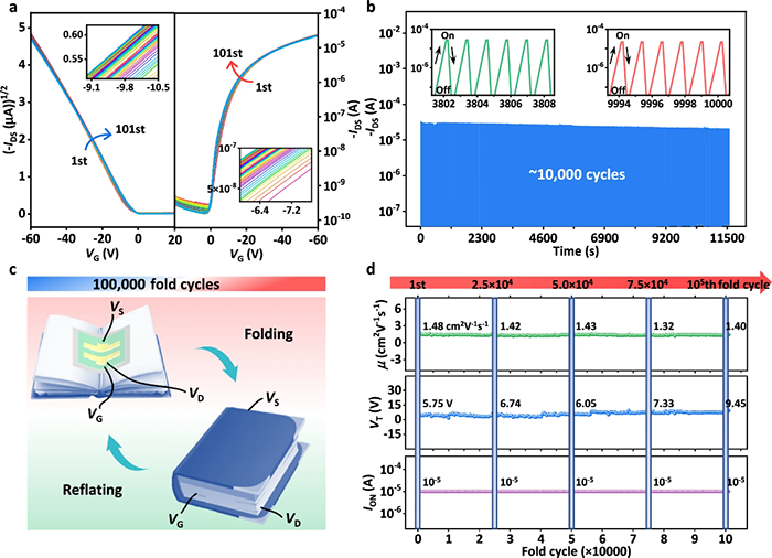 作者展示了一种简单且强大的双保护层光刻策略,采用共轭聚合物作为抗水层,为有机材料的无损光刻建立了超薄双重保护系统。该策略兼具以下特性:亚微米级图案精度(0.5 µm)、适用于所有有机材料的普适性、保护层材料与厚度选择的高度自由度,以及100%的光刻图案良率。基于此制备的全光刻柔性有机薄膜晶体管阵列,器件密度达5,120,000个晶体管/cm2,同时保持接近1 cm2V-1s-1的迁移率,两项指标均显著超越此前所有报道的全光刻柔性OTFT。这项工作为制造超集成、高迁移率的柔性有机晶体管阵列提供了通用平台,最大限度地发挥了光刻技术和有机材料的独特优势,从而为柔性/弹性有机器件迈向商业化铺平了道路。