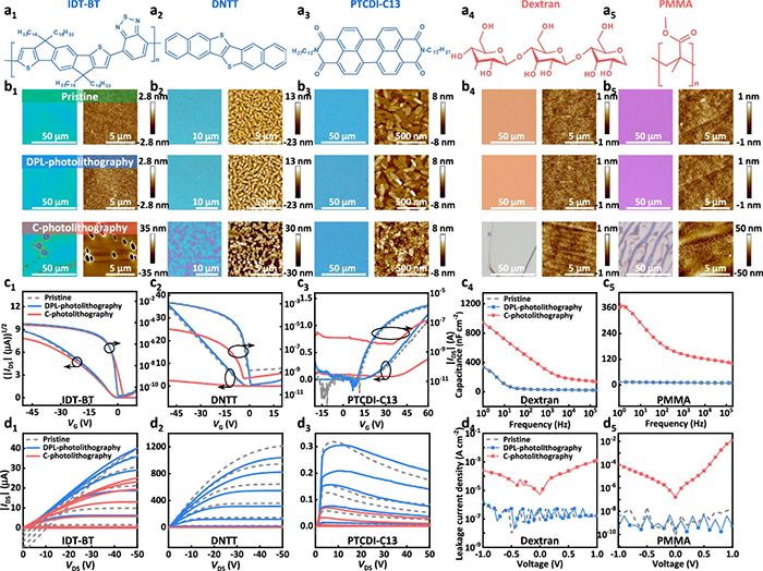 图4:有机半导体/绝缘层的无损光刻图案化。