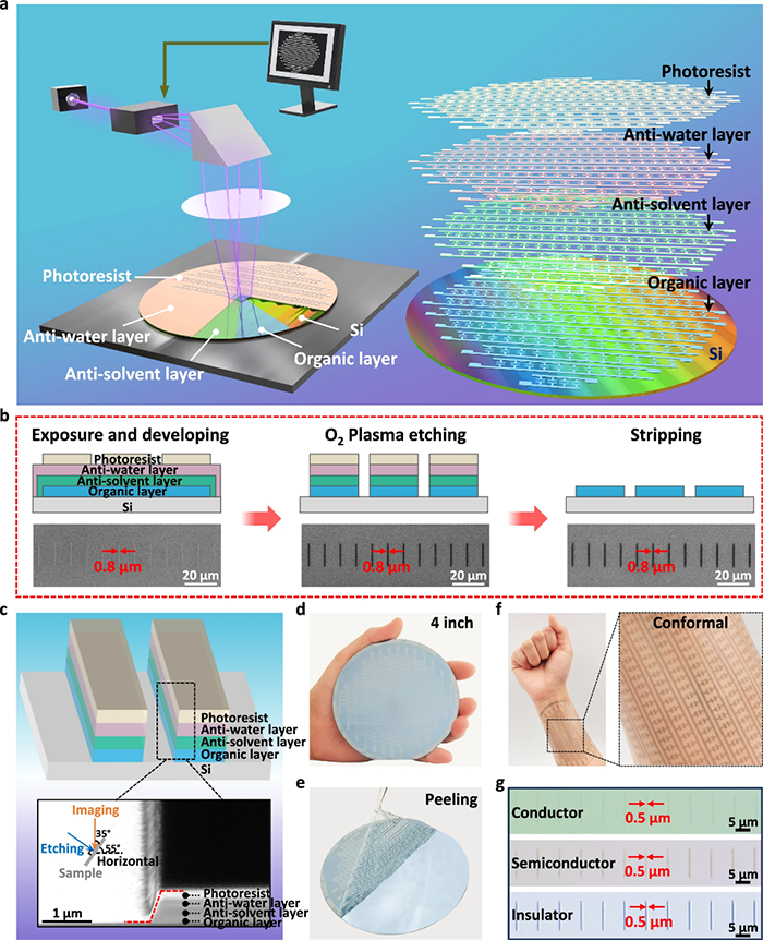 光刻技术作为现代微电子工业的基石,在高集成度、高精度电子器件的大规模生产中具有不可替代的优势。然而,传统光刻工艺中使用的溶剂会使有机薄膜溶胀甚至溶解,导致器件性能严重下降。因此,有机材料与传统光刻工艺不兼容,严重制约了有机电子及柔性电子的集成与产业化进程。