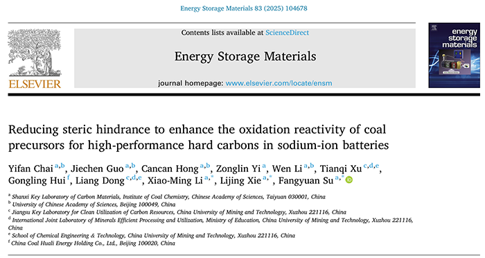近日,中国科学院山西煤炭化学研究所苏方远研究员团队在国际知名期刊Energy Storage Materials上发表题为“Reducing Steric Hindrance to Enhance the Oxidation Reactivity of Coal Precursors for High-Performance Hard Carbons in Sodium-ion Batteries”的研究论文。该研究揭示了煤分子内不同含氧官能团键角对其空间位阻及氧化反应活性的影响机制。基于此,研究提出了煤分子空间位阻调控策略,证明了定向去除高空间位阻的富羰基煤组分可显著促进预氧化过程中含氧交联结构在煤中的高效构筑,为富闭孔煤基硬炭的制备提供了理想前驱体。