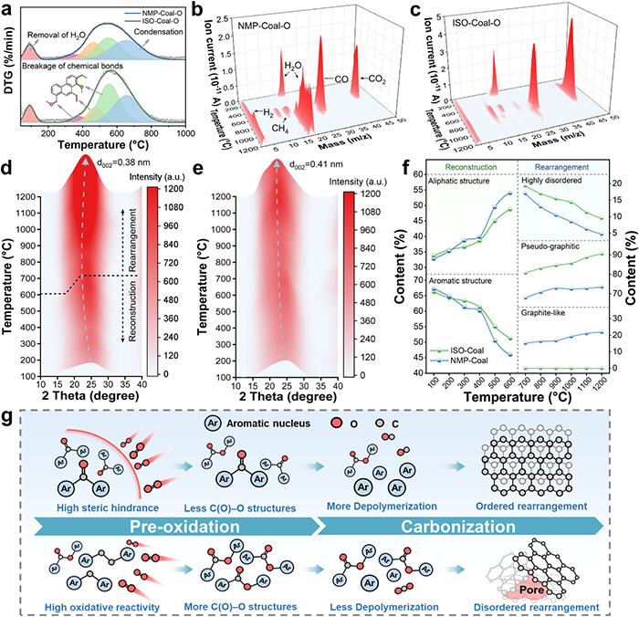 通过TG-MS与原位XRD分析了氧化煤组分在热解过程中的化学反应与微晶演变行为。结果表明,相较于羰基官能团,酯基官能团可有效提升芳香核之间的C–C键能。这一方面阻碍了煤在热解初期的分子热解聚,并保留了煤分子固有的三维无序碳骨架;另一方面,酯基官能团可作为交联结构,阻碍炭微晶发育过程中的碳层热滑移,助力硬炭内部发达闭孔结构形成。