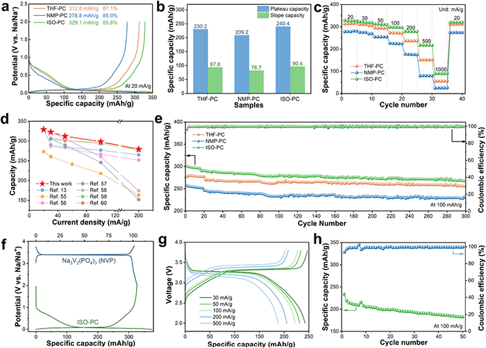 得益于预氧化过程中充分引入的交联结构,优化后的煤基硬炭获得了扩大的碳层间距与高连通性的微闭孔结构。这些微晶结构与孔结构为钠离子的存储提供了适宜的传输通道与丰富的存储位点,从而提高了煤基硬炭的可逆比容量(20 mA/g下容量为329 mAh/g)。同时,硬炭孔结构的高连通性改善了钠离子扩散动力学,显著提升了煤基硬炭的倍率性能与循环稳定性(500 mA/g下循环1000圈的容量保持率为88%)。