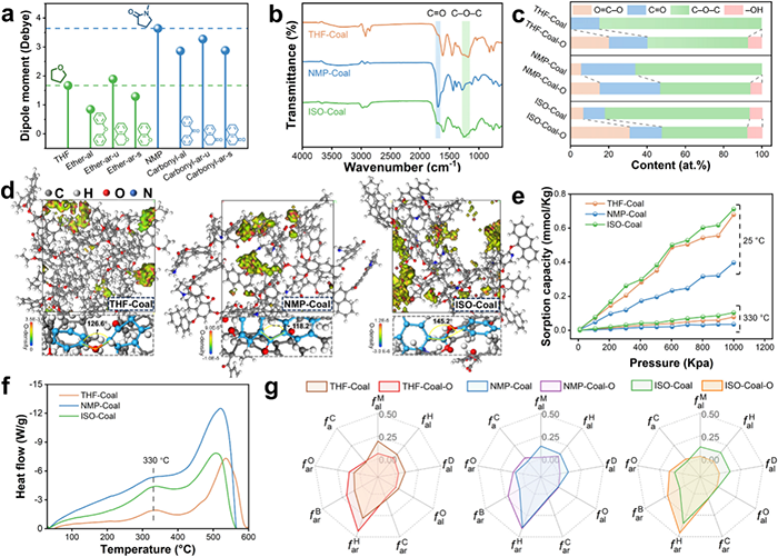 基于“相似相溶”原理,选择含C–O–C基团的四氢呋喃(THF)与含C=O基团的N-甲基-吡咯烷酮(NMP)作为有机溶剂,分别提取煤中富含醚基与羰基的有机族组分。通过DFT、FT-IR、XPS等分析,研究证明了富含不同官能团的煤组分得到了有效的分离。通过分子动力学模拟煤组分分子模型的氧气吸附性能,结果表明富含羰基的煤组分的氧气吸附性能较差。这主要是由于富羰基煤组分中 C=O 官能团具有较小的键角,赋予了该组分较高的空间位阻,抑制了氧气与煤分子内部的深入接触。同时,这些羰基官能团可与芳香环形成共轭结构,阻碍了预氧化过程中三维交联结构在煤分子中的构筑。