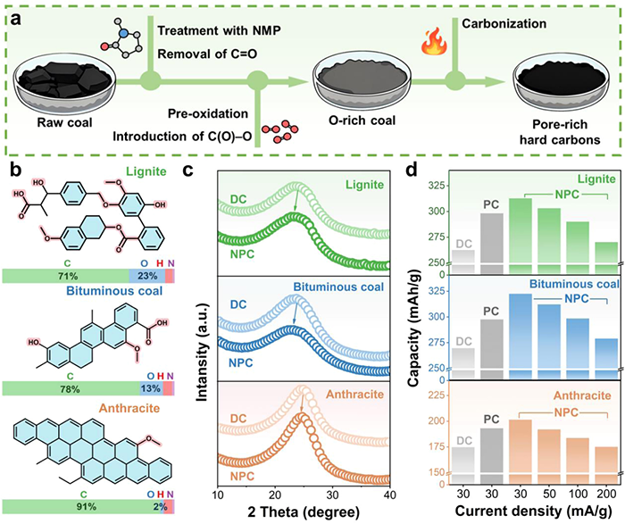 研究进一步以褐煤、烟煤与无烟煤作为前驱体,使用“NMP一步抽提法”去除了煤中的富羰基有机族组分。与未处理的煤样相比,所有优化后的煤基硬炭均获得了更理想的结构特性与更优异的储钠性能。因此,研究证明了煤分子空间位阻调控策略在调控各类煤的氧化反应活性,制备高性能煤基硬炭的普遍适用性。