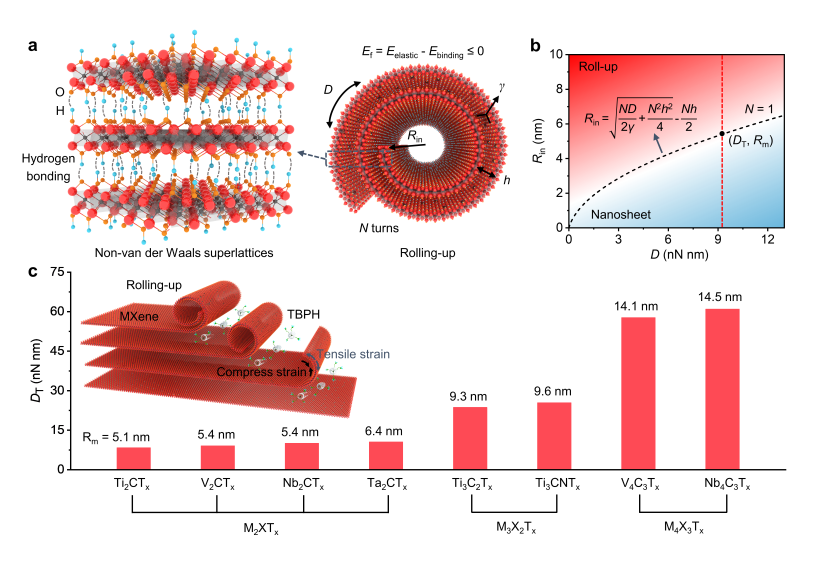 突破传统限制:传统人工超晶格均基于二维范德华材料,依靠弱范德华力堆叠,层间耦合弱、易受环境干扰。本研究通过“刚度介导滚动”策略,首次成功合成了一类由碳化物和碳氮化物构成的非范德华超晶格